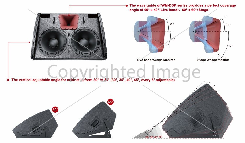 Волновод серии WM-DSP обеспечивает идеальный угол покрытия 60° x 40°(Live band) и 60° x 60°(Stage), что позволяет добиться симметричного покрытия звуковым полем больших и средних шоу и живых групп.